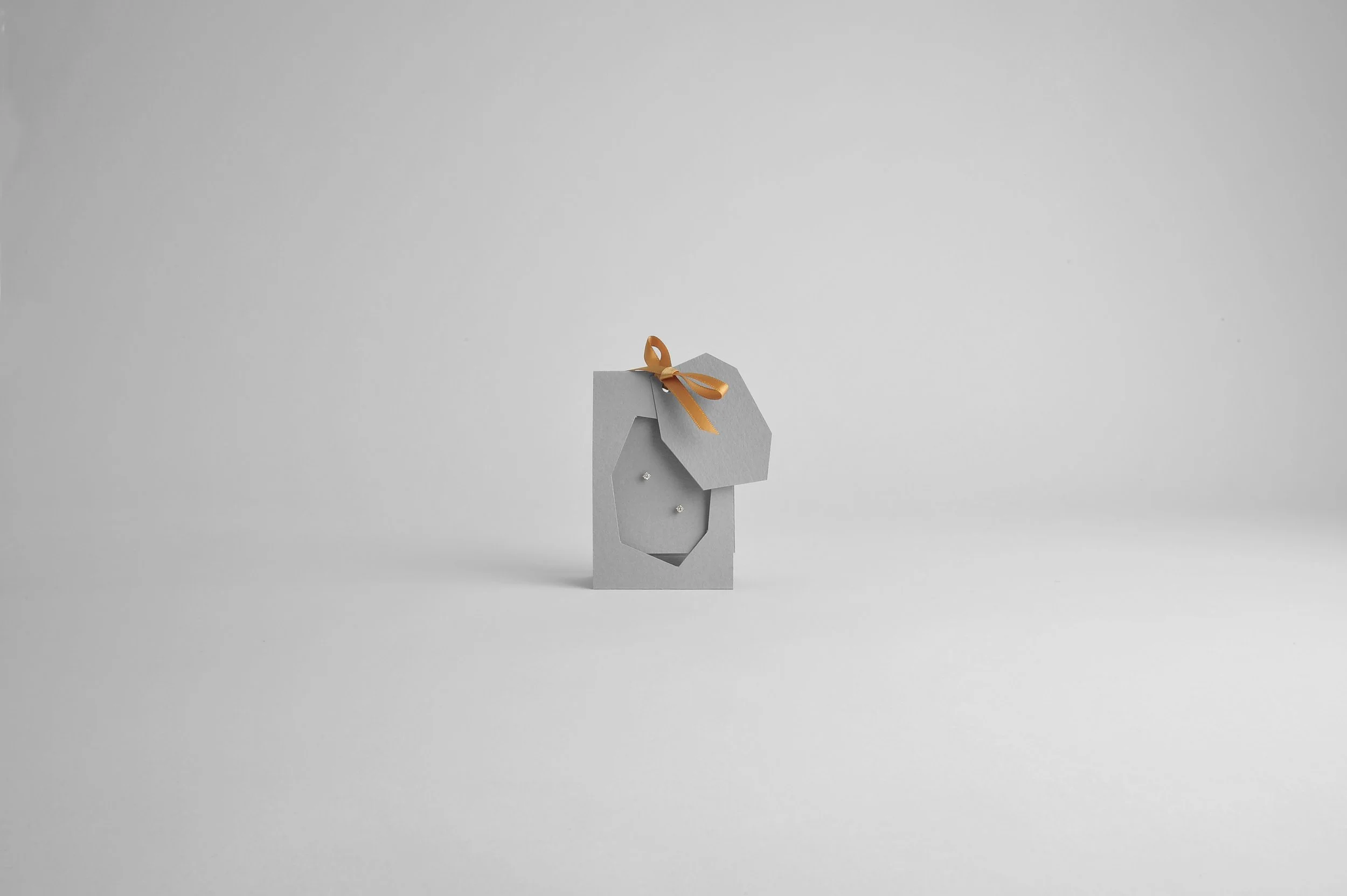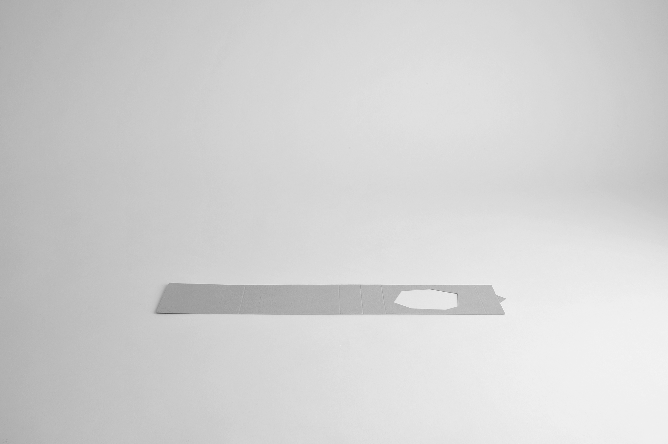 Conceived for one of our first few projects, study model HF00 (refer to Fig. A) is an accessory packaging with a cut-out window. HF00 was an attempt to utilize the cut-outs (waste) as a hang tag or a small business card (refer to Fig. B) after the die-cutting process.