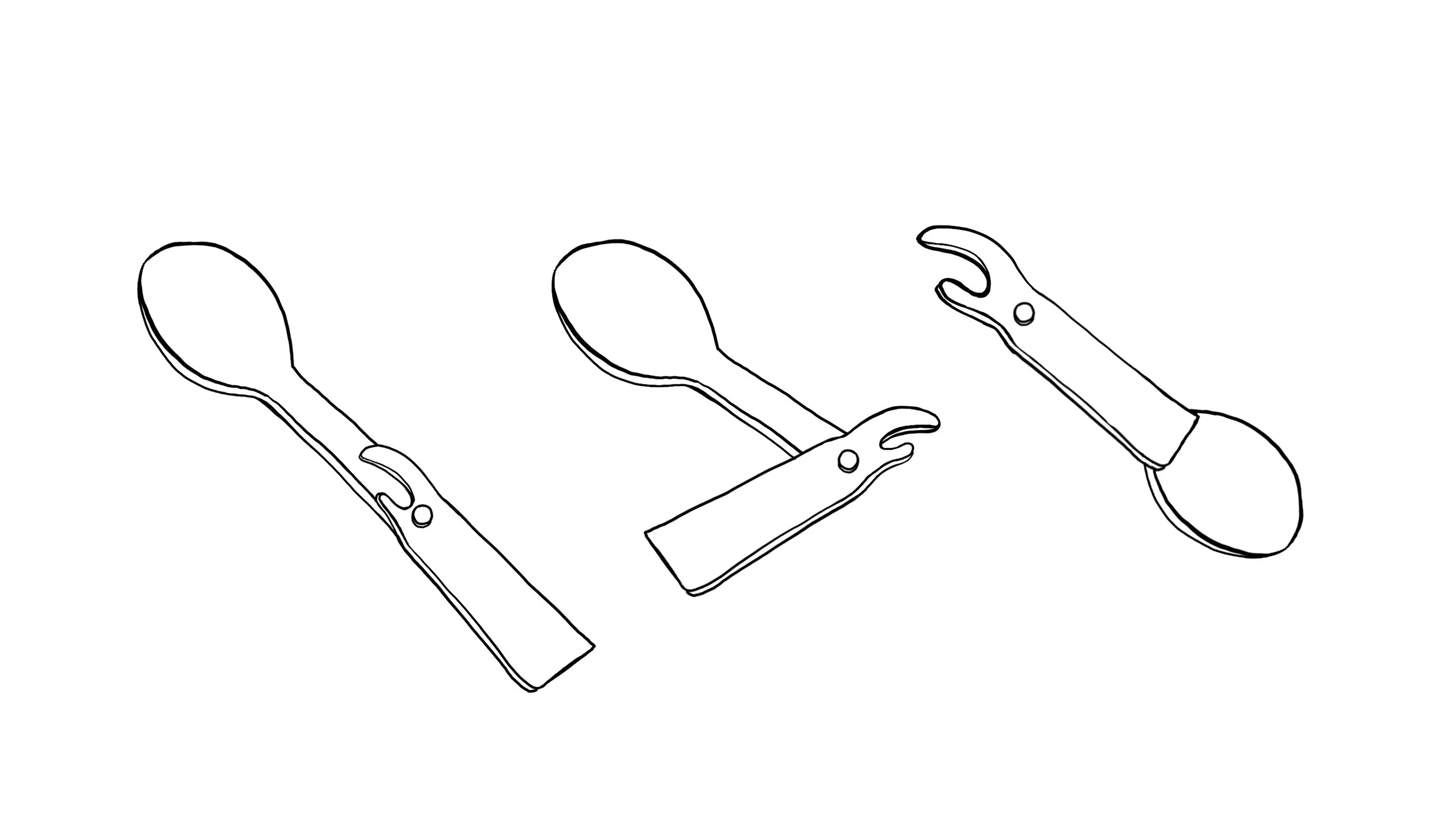 The scenario of outdoor dining would then suggest other dining-related actions to be possible dormant functions that could be integrated with the motion of swivelling. A can opener could be an ideal dormant function as it allows for swift access to and consumption of the food from a can. The foldable camping spoon is then able to serve its maximum function as a portable dining device, with the different functions afforded in its two states.