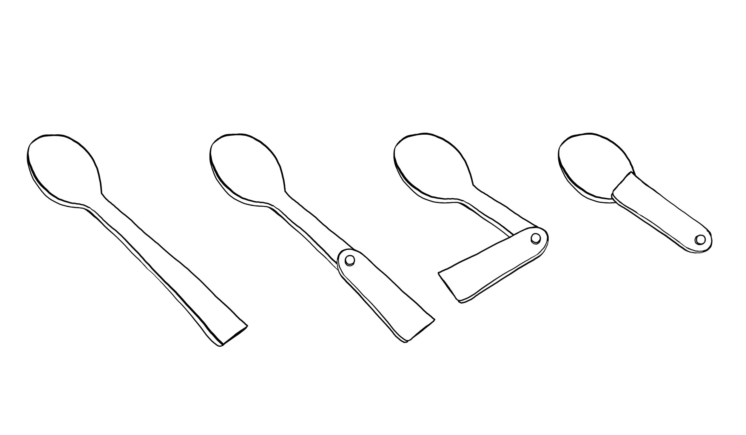 Deciding on a dormant function begins with a careful study of the attributes, relationships and situations surrounding the primary function of an object, before integrating it with its associated motion. In the case of the foldable camping spoon, a portable scooping device is its primary function and swivelling is the motion that enables this portability.